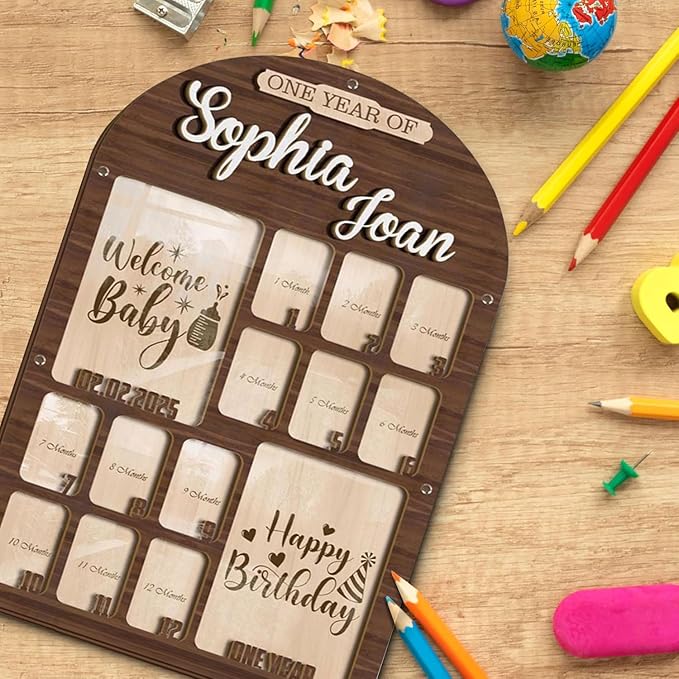 - My First Year Photo Frame: Capture your baby’s first year with our babys first year picture frame. This baby first year photo frame helps you record their growth from newborn to one year, showcasing each milestone in a 12 month picture frame for baby first year. The wooden plaque includes space for your baby’s full name, making it a personalized keepsake. Our 12 month pictures for baby first year, my first year photo board, one year photo board is a wonderful way to celebrate these moments.