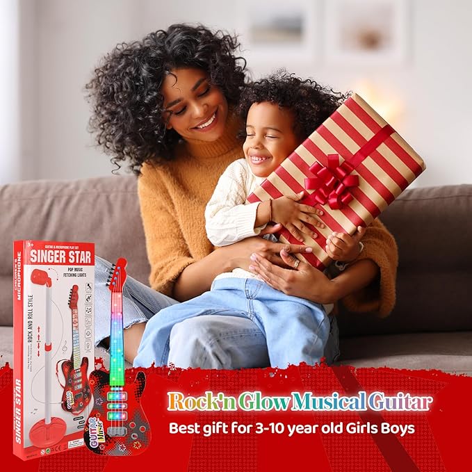 - 【Toddlers Guitar Early Learning Toys】——Music plays a crucial role in children's development! Electric guitar for infant and toddler with nursery rhyme melody and dazzling colourful lights accompanies the growth of girls and boys, while cultivating kid's interest in music, helping you teach your child beats or other music theories. The mini microphone and adjustable stand set will simulate speech and performance scenarios anytime and anywhere, enhancing your child's self-confidence and social skills.