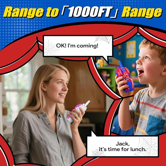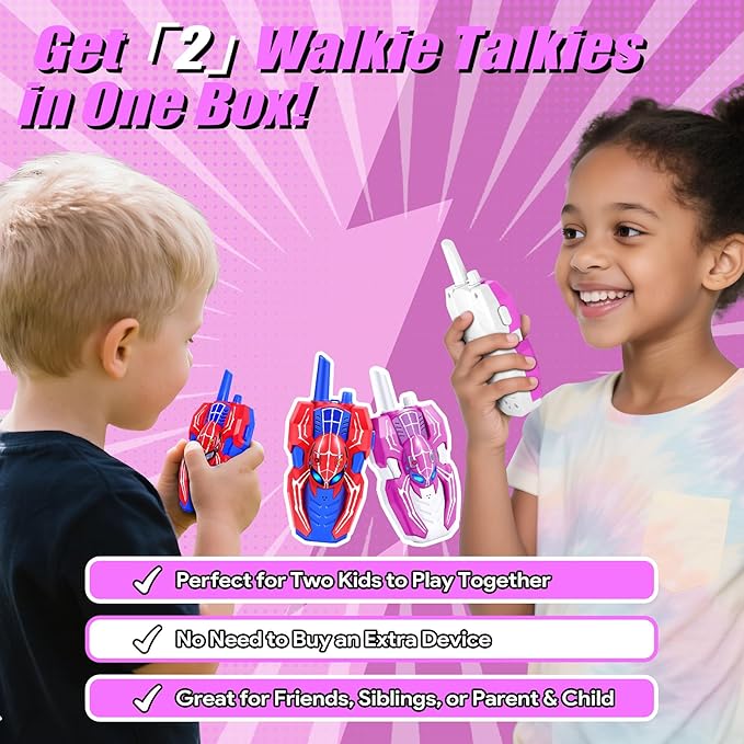 - Spider Walkie Talkies: Inspired by superhero role-play, these kids walkie talkies feature a fun spider theme loved by kids. Lightweight at just 100g, they are perfect outdoor toys for kids ages 3-12, whether exploring the backyard or on a camping trip