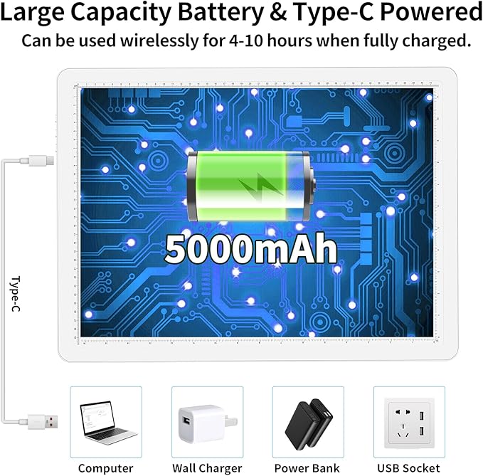 - 【 High Capacity Battery Powered Lightbox 】 With 5000mAh rechargeable lithium battery, the magnetic tracing pad can work continuously for 4-10 hours wirelessly. Convenient for you to use it anywhere in your home or on your journey. Equipped with upgraded fast charging Type C cable, easy to access any Type-C port, charging is fast and efficient. Both battery mode and charging mode are applicable. Also,the USB-C interface is more stable than the Micro interface.