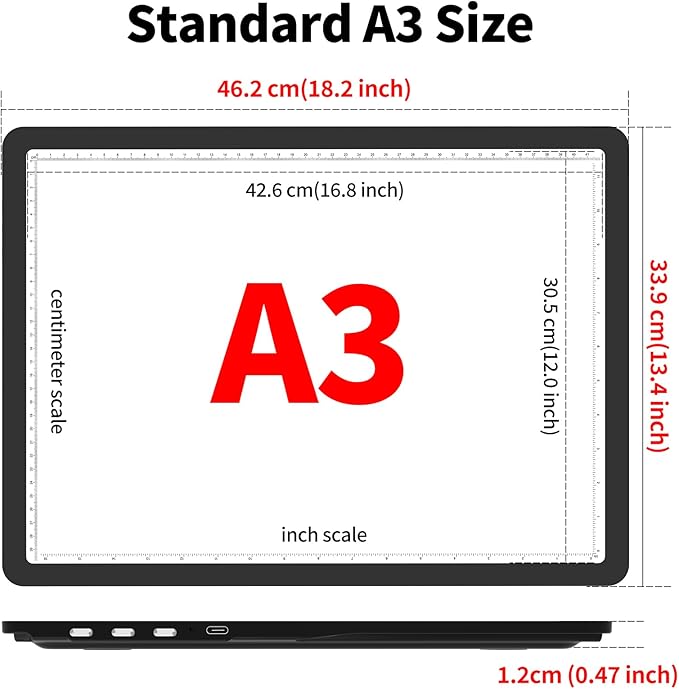 - 【 Standard A3 size, CM-INCH double scale 】 This Rechargeable super bright lightpad Overall Size is 46.2 x33.9 x 1.2 cm ( 18.2 x 13.4 x 0.47 inches ), and the visual working area is 42.6 x 30.5 cm ( 16.8 x 12.0 inches ). Illuminated area large enough for international standard A3 paper. This Light Drawing Sketch Pad has a dual scale of centimeters and inches to meet your various usage habits.