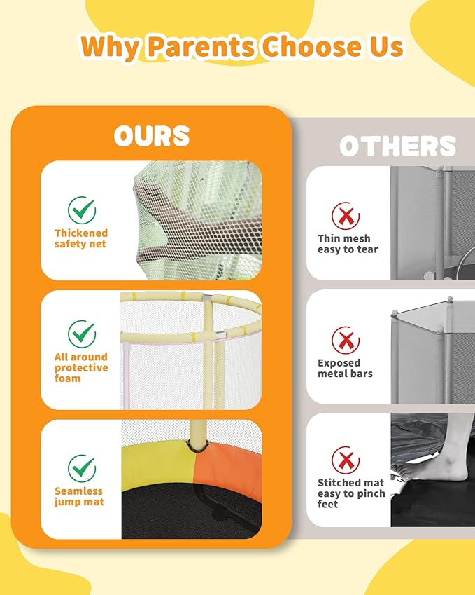 - 【All-Around Safety Design】This outdoor trampoline features a thickened mesh safety net, 360° foam-padded handlebars, and a seamless PP jump mat—no gaps, no pinched toes. It meets the strict ASTM F381-16 safety standard for consumer trampolines, ensuring peace of mind for parents. Every part is independently tested for stability, long-lasting durability, and safe play for children aged 1–8, whether indoors or outdoors.
