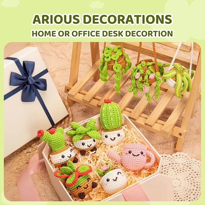 - 【9-in-1 Mini Plant Crochet Kit】Includes 8 cute plants (succulent, cactus, hanging vine, pearl string & more) plus a mini watering can. Bright colors & adorable shapes create a relaxing DIY crochet garden.