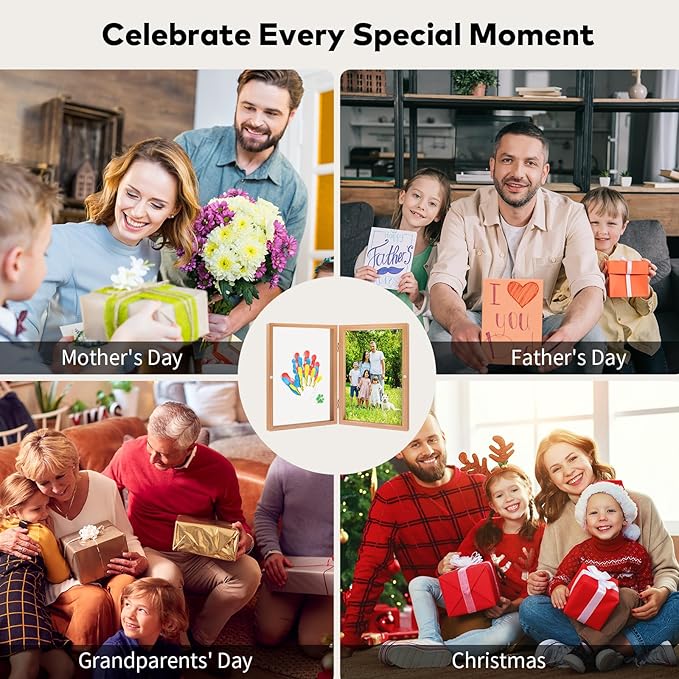 - DUAL DISPLAY MODES & PHOTO AREA: Our upgraded keepsake frame also have a photo frame feature, the photo side is big enough to hold one large photo or several smaller ones. Imagine this framed treasure on your living room wall: your toddler's tiny hand nestled in yours, surrounded by family photos that spark conversations for generations