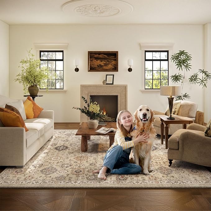 Machine Washable Rug for Living Room: 8x10 Area Rugs Boho Vintage Rug Stain Resistant Non Slip Low Pile Soft Lightweight Carpets for Bedroom Kitchen Dining Room Nursery Kids Room Farmhouse