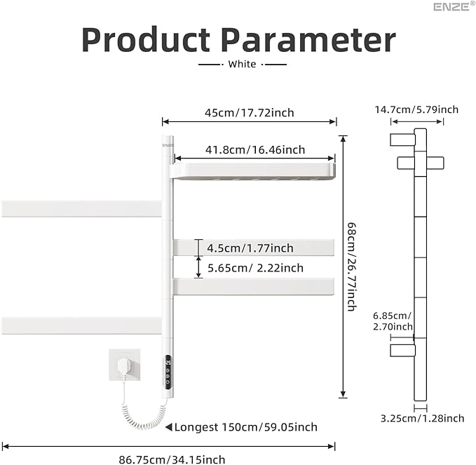 - 【180° Rotating Arms with Optional Shelf】 The towel dryer rack features four 180° rotating arms to hang multiple towels efficiently, ideal for towel warmers for bathroom small space. Choose models with or without a practical shelf for extra storage.