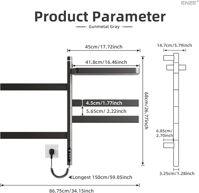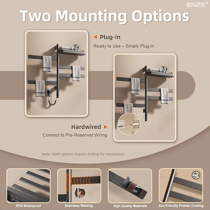 - 【Flexible Installation: Hardwired or Plug-In】 Designed as a hardwired towel warmer or plug-in unit, install this wall-mounted heated towel rack with included hardware and instructions. Great as a towel heater rack or electric towel drying rack for any bathroom setup.