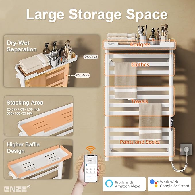 ENZE Heated Towel Rack with Shelf and Wi-Fi App Control, 11 Bars Electric Wall Mounted Towel Warmer with Timer & Adjustable Temperature, Low Carbon Steel, Plug-in/Hardwired, White