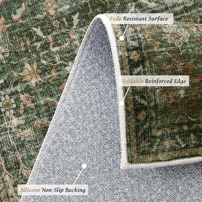 Washable 5x7 Area Rugs for Living Room, Boho Non-Slip Silicone Backing Rugs for Bedroom Dining Room Nursery Office, 0.3" Neutral Oriental Throw Carpet with 0.16" Cushioning Pad, Grass Green/Multi