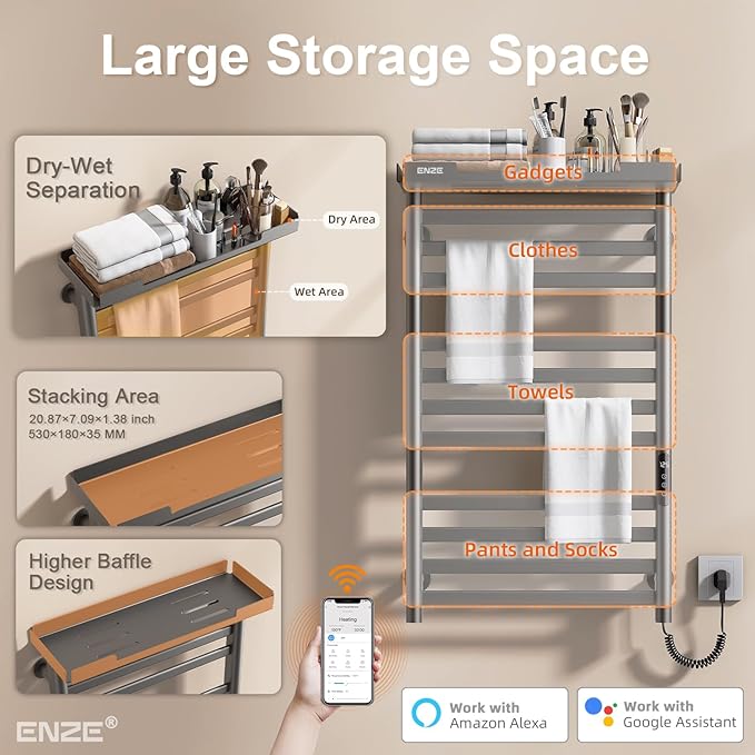 ENZE Heated Towel Rack with Shelf and Wi-Fi App Control, 11 Bars Electric Wall Mounted Towel Warmer with Timer & Adjustable Temperature, Low Carbon Steel, Plug-in/Hardwired, Gray