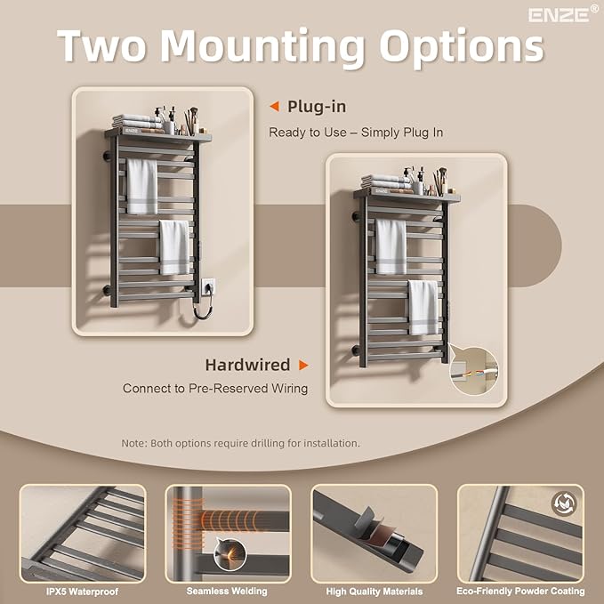 - 【Flexible Installation: Plug-in/Hardwired】 Whether you're retrofitting or renovating, this unit supports both plug-in towel warmer bars and hardwired towel warmer installations. Made of eco-coated low carbon steel, it’s a durable heated towel rack for bathroom, ideal as a wall-mounted heated towel rack or towel bar warmer for bathroom.