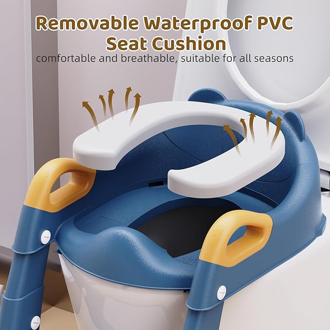 - β[COMFORTABLE SEAT CUSHION& SPLASH GUARD]: Toilet training seat for toddlers is equipped with waterproof PVC seat cushion, soft touch to protect your baby's sensitive skin, more comfortable than traditional plastic baby potty training toilet. No sticky in summer, no cold in winter, say goodbye to traditional hard potty seat now! The more intimate design is 3.2 inch raised front splash guard effectively prevents spills and is also suitable for boys and girls!