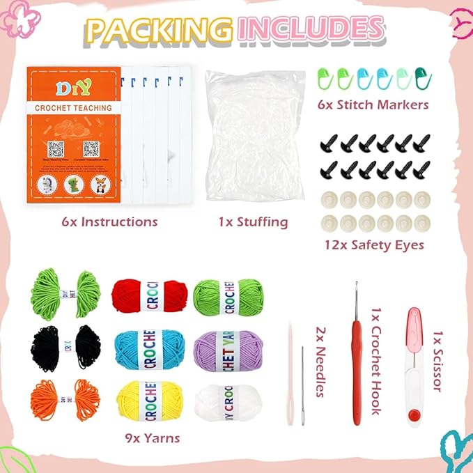 - ALL IN ONE CROCHET KIT】: Along with Easy Yarn and easy-to-follow video tutorials, you'll receive every other tool you'd need to begin crocheting with our kits. The beginner crochet kit also includes a scissors, a crochet hook, 2 needles, eyes, 6 marker buckles, cotton stuffing, 6 written crochet patten instructions and video tutorials.