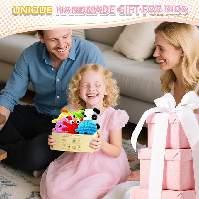 - 【CROCHET KIT FOR COMPLETE BEGINNERS】: Our 6 PCS Crochet Kids Kit is perfect for complete beginners; Our step-by-step video tutorial accompanies DIY starter kit and its easy to follow; A pre-started crochet piece comes included along with other beginner-friendly supplies. Looking for cute crochet animals kit, This makes the perfect knitting toy.