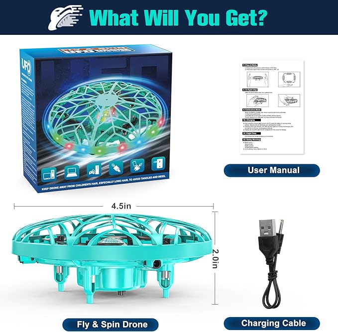 - 360° Rotating Flight Design: Fly this mini UFO drone toy with your hands! Place both hands on both sides of the drone, swipe a hand under when the lights start to blink rapidly, and watch this LED drone perform a 360° flip