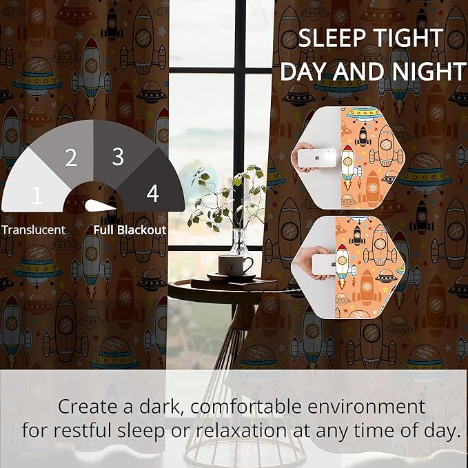 Kids Space UFO Rocket Blackout Curtains - 100% Blackout, Thermal Insulated, Noise Reducing, Perfect for Kids Room and Nursery, 2 Panels (Sunny Space Parade, W52×L84)
