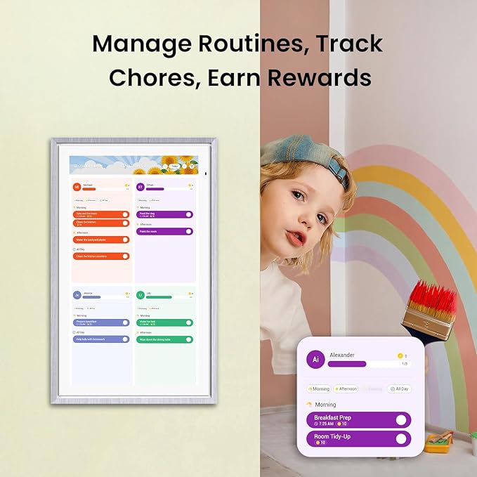 - Interactive Chore Chart & Routine Planning — Powered by our self-developed ApoloSign Calendar system—assign tasks, track with color codes, motivate kids with a rewards system, and manage grocery, shopping, or wish lists from the Calendar or Mobile App.