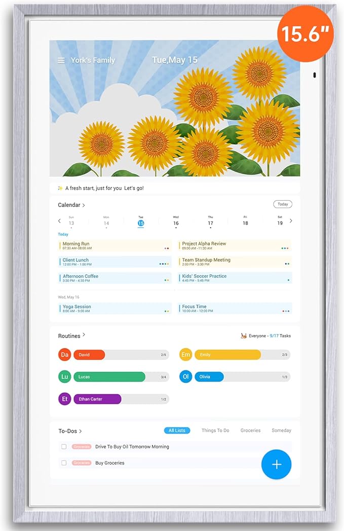 - Smart Photo Frame, Without Subscription — 15.6" HD touchscreen with anti-glare, adaptive auto-brightness, and eco-friendly sleep mode. Certified Amazon Climate Pledge Friendly, crafted with sustainable materials. Wooden frame for wall mounting or desktop use, transforms into a smart photo frame or live screensaver—sync with Google Photos or upload directly, no subscription required.