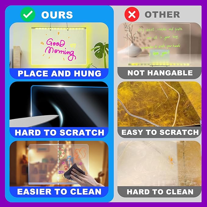 - Versatile for Every Scene: More than a drawing board! The LED writing board set includes static cling sheets. Even when unlit, they enhance your acrylic board's visual appeal. Peel them off anytime - they leave absolutely no residue at will. Use it as a glowing message board in kids’ rooms, a notepad for office plans, a kitchen checklist. Whether at home, the office, or a cafe, it adapts seamlessly to work, study, or play.