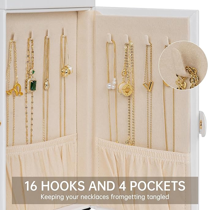 - 6 LAYERS with 5 Versatile Pull Out Drawers 2 Hidden Side Cabinets, The two deeper bottoms of the 5 removable drawers has only one compartment; Drawer 1 has 16 equal size slots; Drawer 2 has 9 equal size slots; Drawer 3 has 3 equal size slots. The 2 Swing out Cabinets including 8 hooks and 2 pockets, help to keep your necklaces from getting tangled