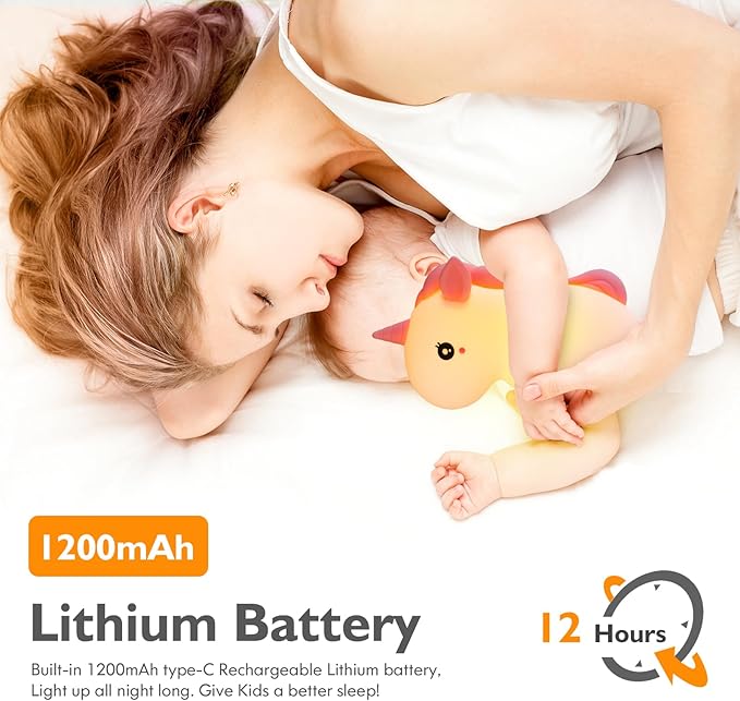 - 🦄 SAFETY & SQUISHY: This flexible and soft Unicorn lamp material is made from BPA-free smooth silicone that allows you to play in any way and keeps its original shape after heavy long-term use, Washable to keep it clean forever! The one-piece design of the back parts cannot be dropped due to children's pulling, chewing, etc. To ensure the absolute safety of children's use, parents can be rest assured