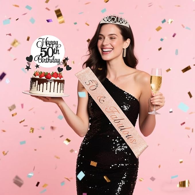 - 50th Rhinestone Crown & Sparkly Sash: The birthday sash, made of soft fabric via hot-press stamping glitter technique, features superior quality with non-shedding glitter and rose gold 50&Fabulous letters. The crown, crafted from sturdy hard alloy with dazzling rhinestones, is meticulously designed for 50th birthday parties.