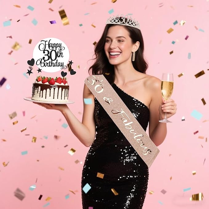 - 30th Rhinestone Crown & Sparkly Sash: The birthday sash, made of soft fabric via hot-press stamping glitter technique, features superior quality with non-shedding glitter and rose gold 30&Fabulous letters. The crown, crafted from sturdy hard alloy with dazzling rhinestones, is meticulously designed for 30th birthday parties.