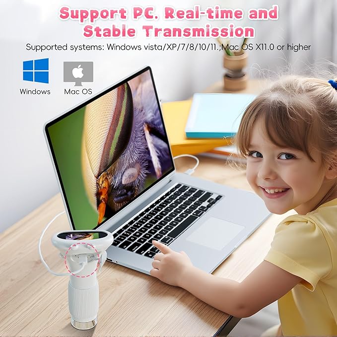 - PC Connection & Sharing: Connect the USB digital microscope to a computer using the included cable for large-screen real-time viewing (compatible with Windows Vista/XP/7/8/10/11 and macOS X 11.0+). Easily save and share your child's explorations and discoveries with family and friends.