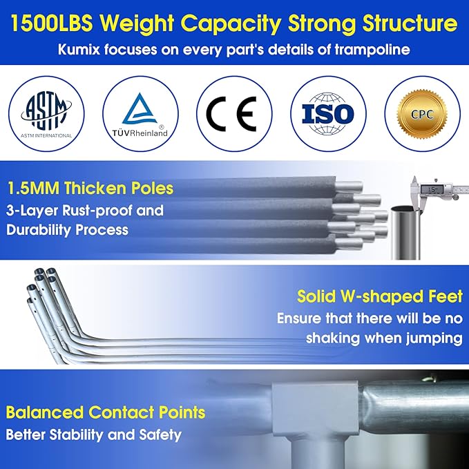 - 👍Focus Every Detailed Point: No-gap design safety inner enclosure net securely and closely attached to the jumping mat all the way around; 1.5mm galvanized steel pipes are treated to prevent rust which is more rust-proof and durable than ordinary steel pipes; 80mm full spray steel springs are stronger, more anti-rust, anti-corrosion and longer life; 4pcs trampoline anchor set can reduce your losses in high wind weather.