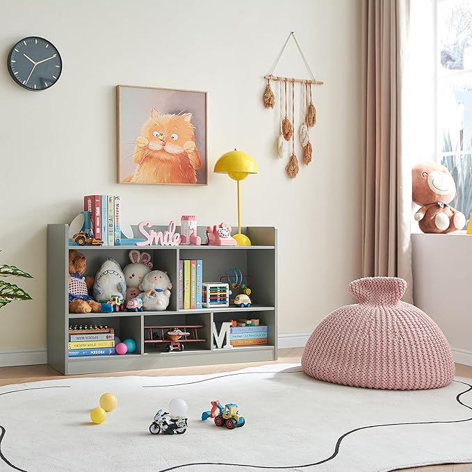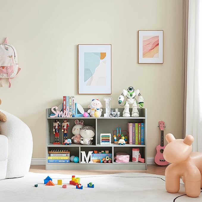Kids Toy Storage Organizer, 5-Section Bookshelf for Organizing Books Toys, Wooden Storage Cabinet Daycare Furniture for School, Classroom Playroom, Nursery, Kindergarten (Grey)