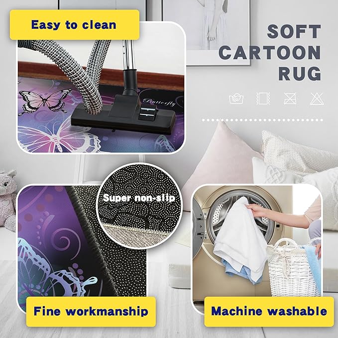 Beautiful Butterfly Fantasy Rug for Playroom Girls Bedroom Colorful Rainbow Butterfly Decor Area Carpet 2x3 Purple Mat 3D Printed Non-Slip Washable