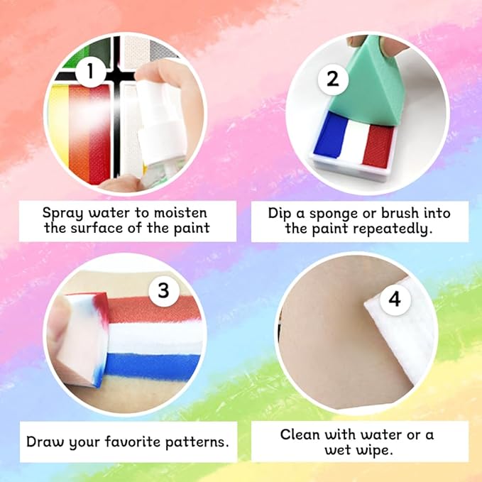 - Easy to Use & Clean – A favorite among beginners and pros! The water-based paint activates with a little water—simply dampen the brush/sponge, swipe, and apply smoothly. Dries quickly without smudging, and washes off effortlessly with soap and water or wipes. No mess, just fun—why it’s loved for quick party setups!