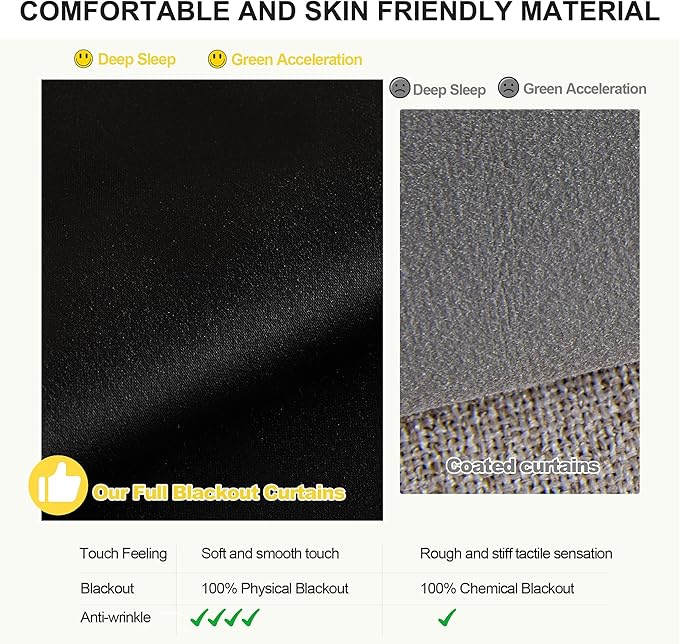 - 100% BLACKOUT: These curtains are manufactured in a STANDARD 100 certified by the OEKO TEX factory. The curtains can block out 100% bright sunlight and UV ray, bring you a full room darkening environment for good night sleep, afternoon nap and weekend lie-ins.
