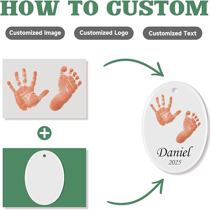 - FIRST CHRISTMAS ORNAMENT: Click "Customize Now" to upload a photo of your baby's handprint/footprint, add name and date. This personalized ornament is perfect for commemorating your baby’s first Christmas. It is suitable for both boys and girls. Personalizing your own ornament and celebrating baby's first Christmas with this cherished baby's first Christmas ornament 2025.