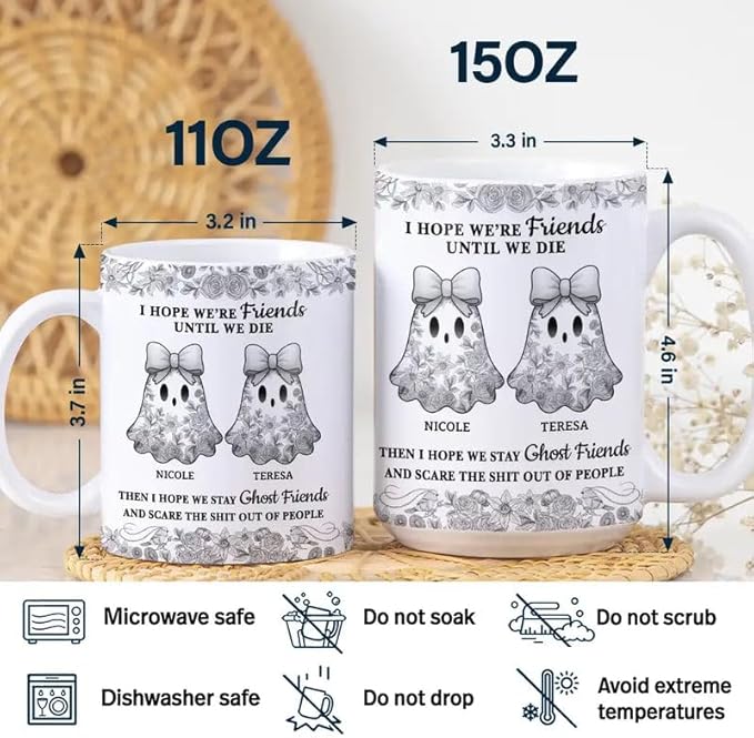Personalized Mug - Trendy France-China Inspired Design - Fun Gift for Best Friends, Halloween Coffee Tea Cup - Cute Ghost Bestie Friends Until We Die Toile De Jouy Pattern